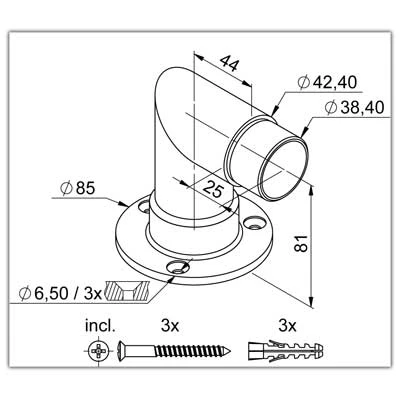 - zum Anschließen eines Handlaufs ø42,4 x 2,0mm an die Wand im 90° Winkel